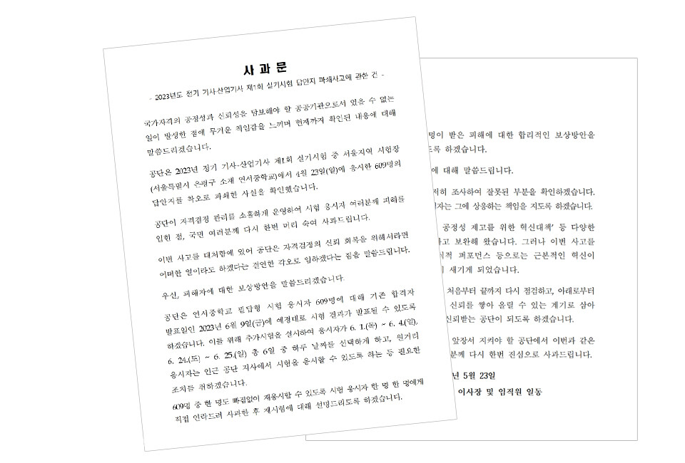 · 지난달 23일 서울 연서중학교에서 치러진 2023년 정기 기사·산업기사 제1회 필답형 실기시험 응시자 609명 전원의 답안지가 채점 전 파쇄됐다.